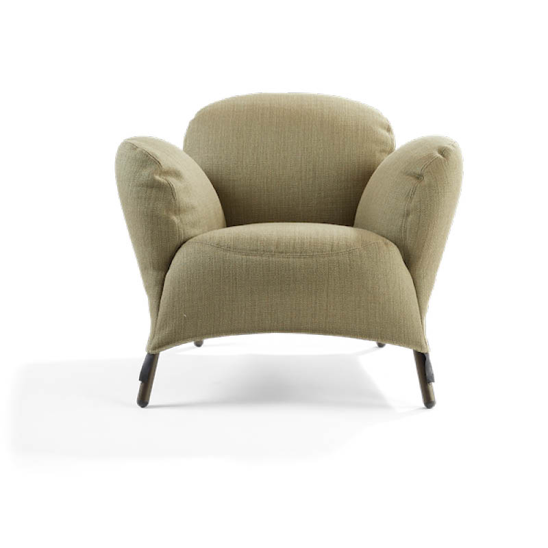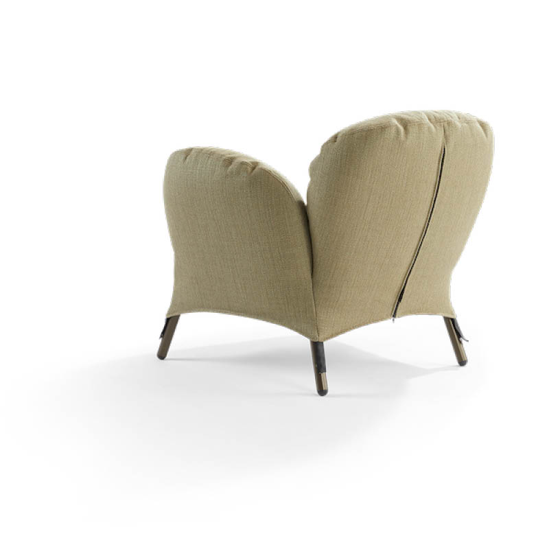De Bobo is het tegenovergestelde van strak. De vriendelijke, ronde vormen en de losse bekleding geven de fauteuil een ontspannen uitstraling. De hoes wordt met kleine lusjes en haakjes strak om de kuip getrokken, een subtiel detail dat zorgt voor dat ambachtelijke karakter waar Label | Vandenberg om bekendstaat.