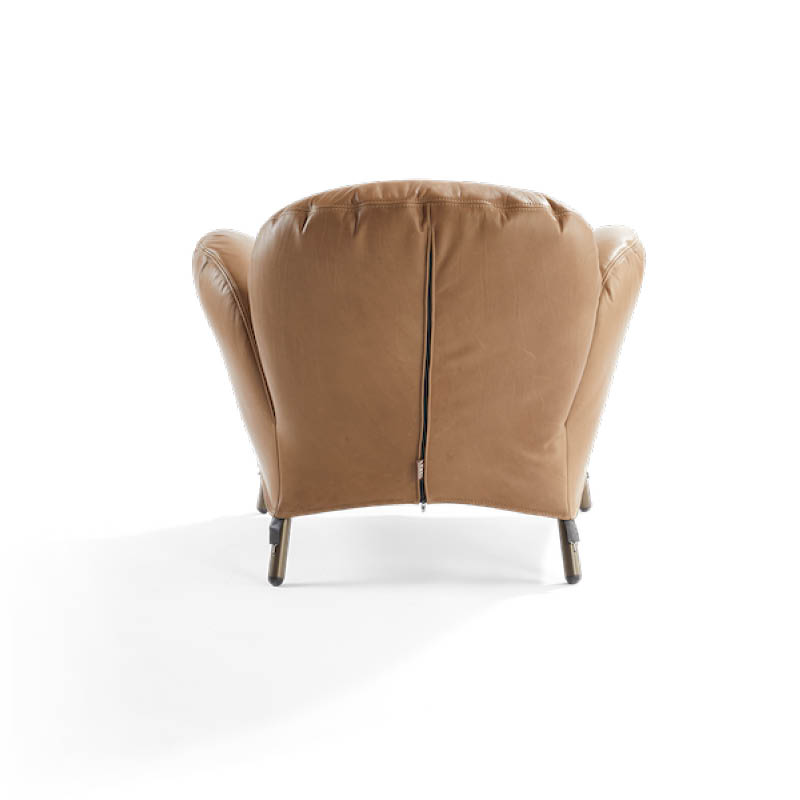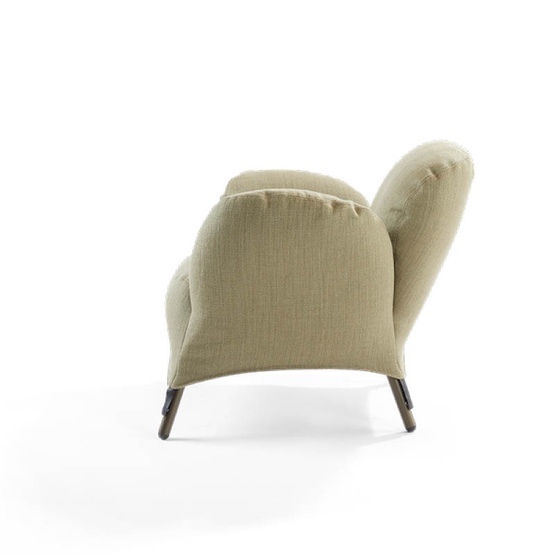 De Bobo is het tegenovergestelde van strak. De vriendelijke, ronde vormen en de losse bekleding geven de fauteuil een ontspannen uitstraling. De hoes wordt met kleine lusjes en haakjes strak om de kuip getrokken, een subtiel detail dat zorgt voor dat ambachtelijke karakter waar Label | Vandenberg om bekendstaat.