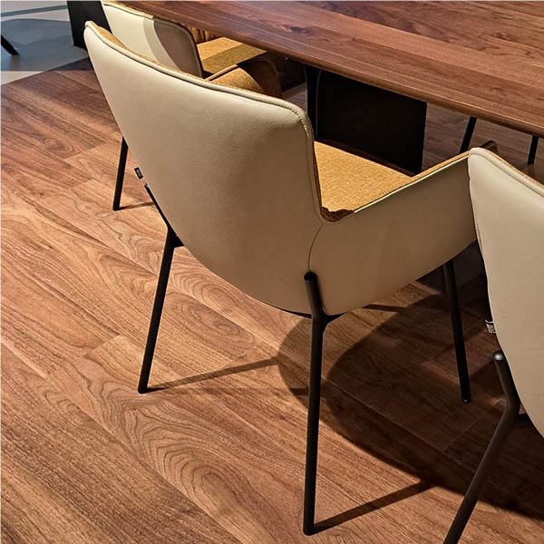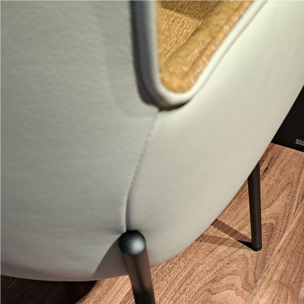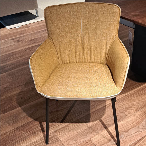 Fris, warm en eigentijds: deze set van 6 Rolf Benz 655 eetkamerstoelen in oker brengt kleur en comfort aan tafel. De binnenzijde is bekleed met een zachte, gemêleerde stof in okergeel, terwijl de buitenzijde is uitgevoerd in beige leer. De combinatie van warme tinten en het zwarte metalen onderstel maakt de stoelen een perfecte match bij een moderne keuken of donkere eettafel.