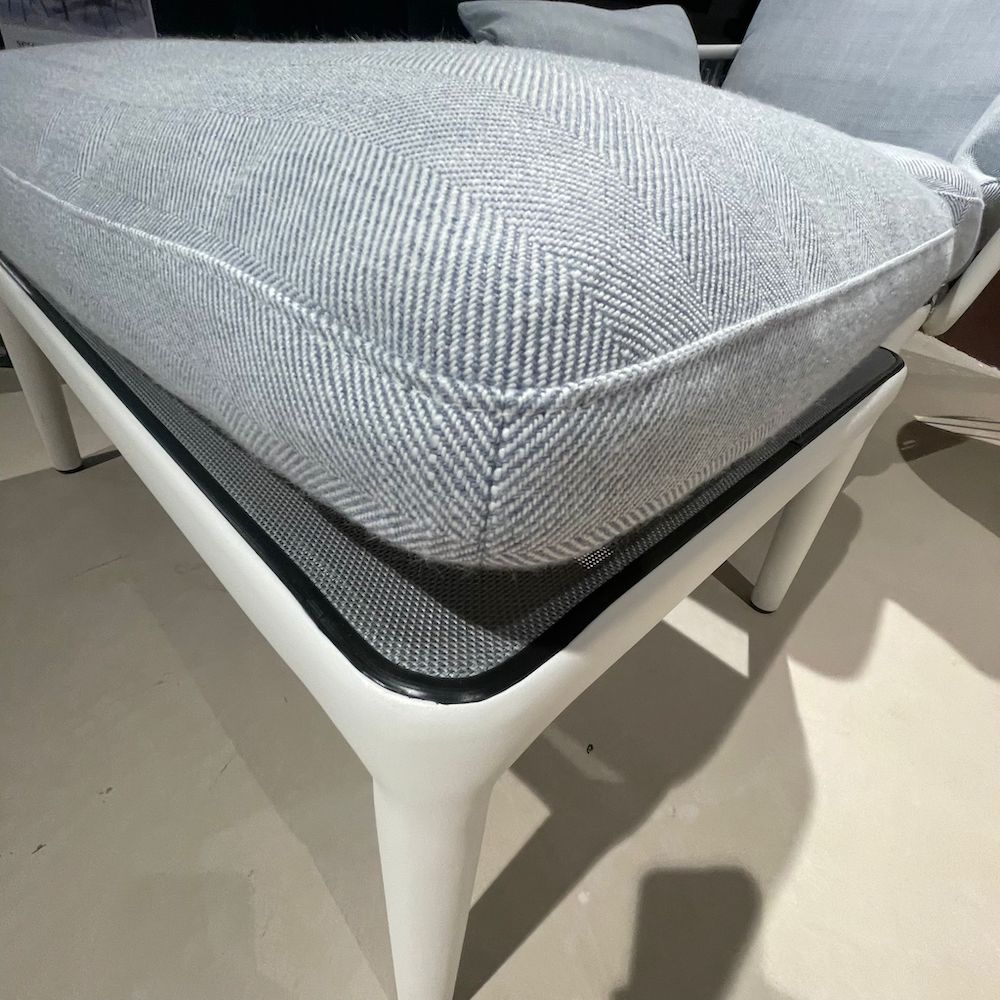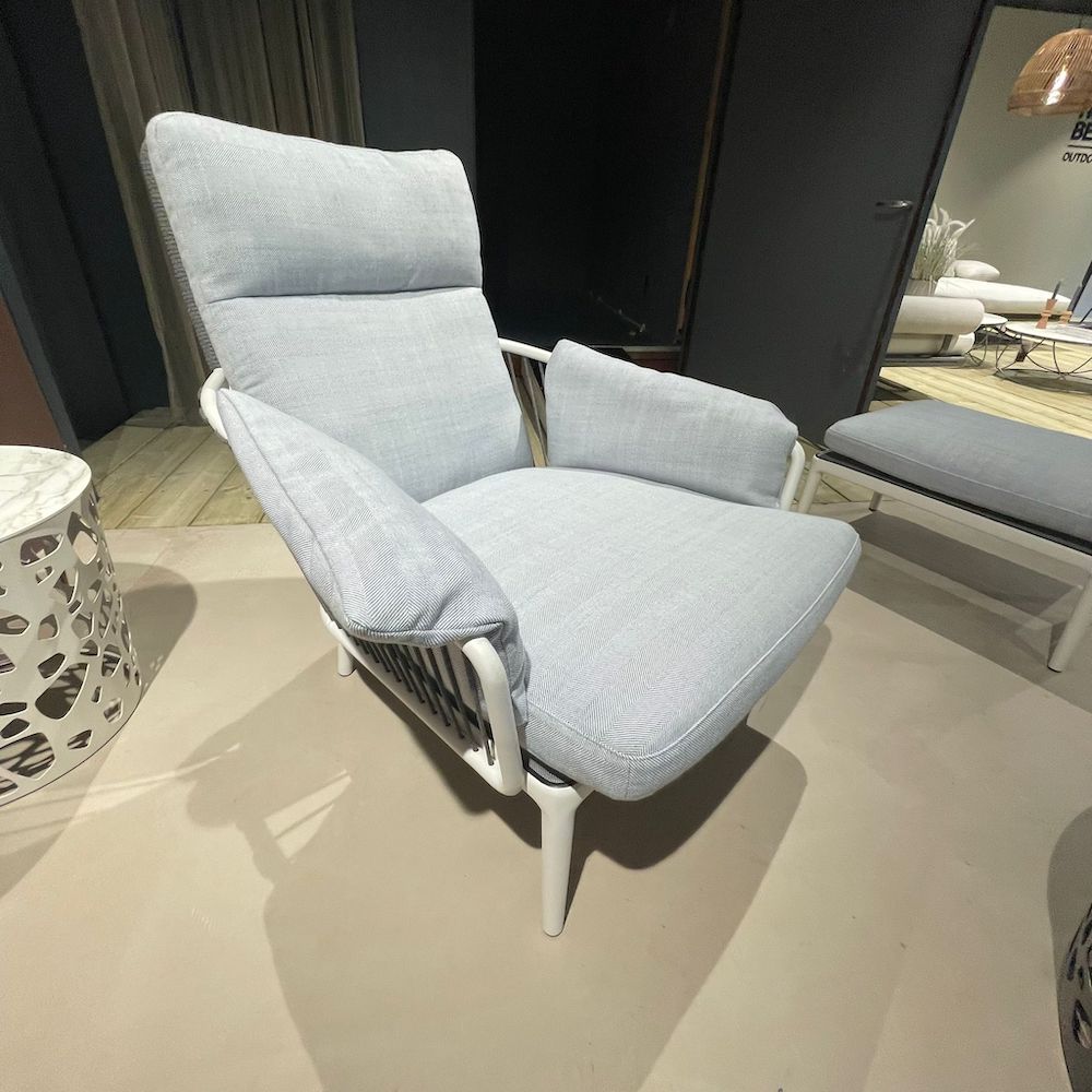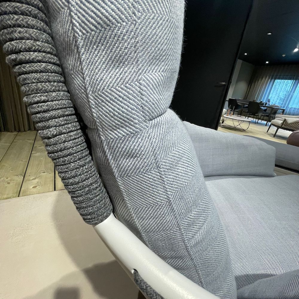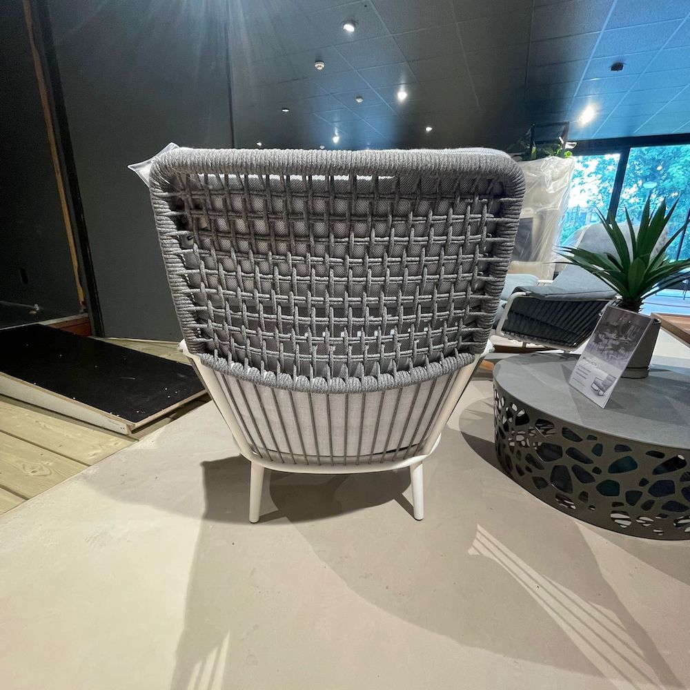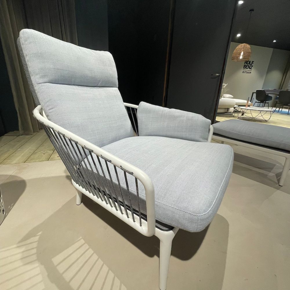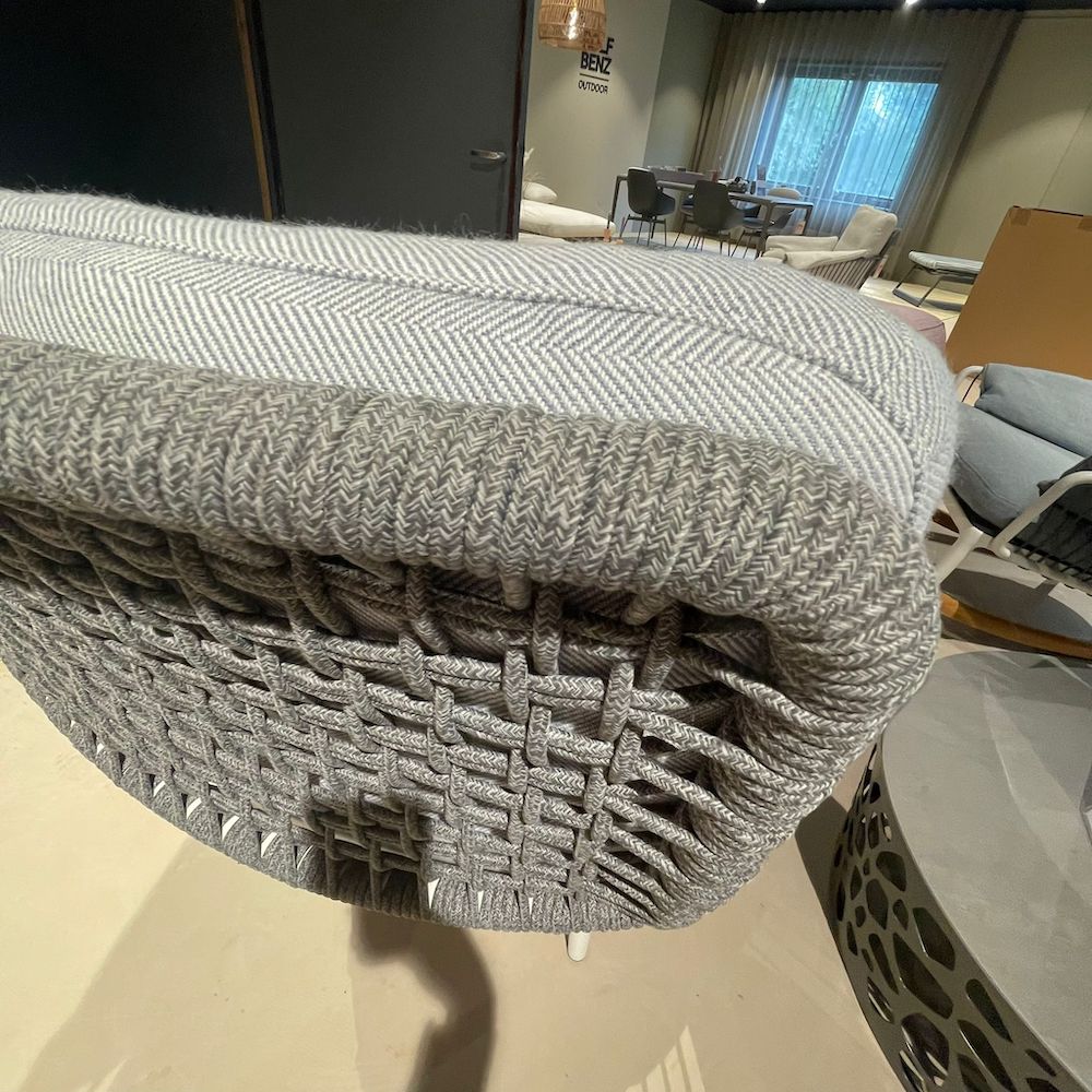 Ontspannen in stijl met deze Rolf Benz outdoor fauteuil in wit met poef. De zachte grijze kussens en losse voetenbank maken dit de perfecte plek om languit te genieten in de tuin. Het witte frame is deels omwikkeld met koord, wat de stoel een zomerse, nautische uitstraling geeft. Deze fijne stoel inclusief voetenbank is nu met korting beschikbaar in onze showroom in Mijdrecht.