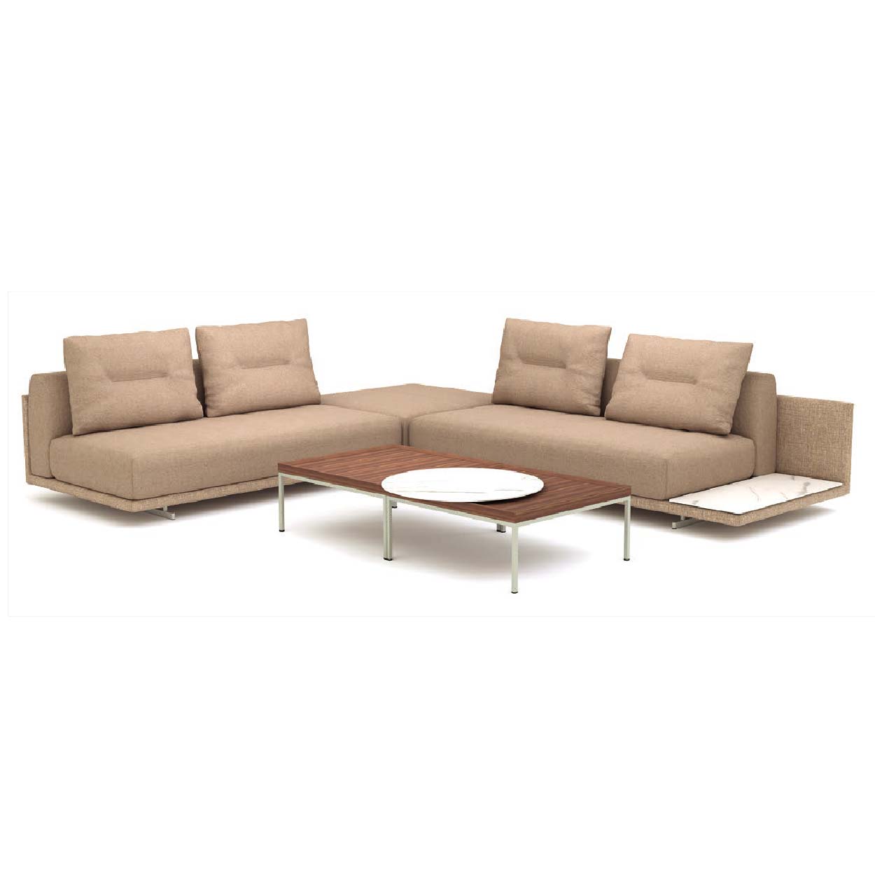 Dankzij de modulaire opbouw stemt u de opstelling precies af op uw ruimte – van compacte loveseat tot royale hoekbank. Ook zijn de delen gemakkelijk her in te delen en te verplaatsen. Voeg optioneel keramische aflegvlakken in Calacatta of Black Coffee Marble toe voor een luxe finishing touch.